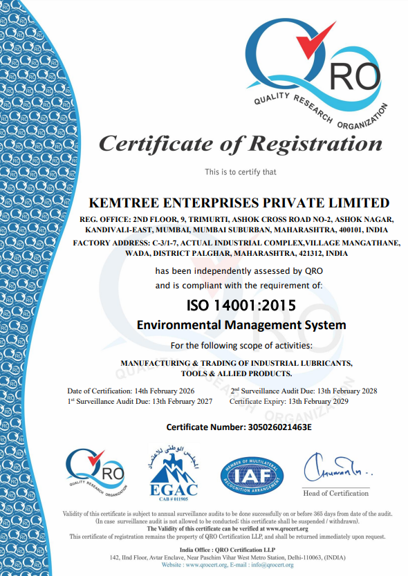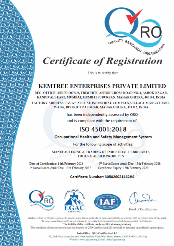 At Kemtree Enterprises Pvt. Ltd., quality, consistency, and compliance are fundamental to everything we do. Our certifications reflect our commitment to maintaining the highest standards in manufacturing, sourcing, and distribution of industrial solutions. Each certification stands as a testament to our adherence to strict quality control processes and globally recognized benchmarks.
